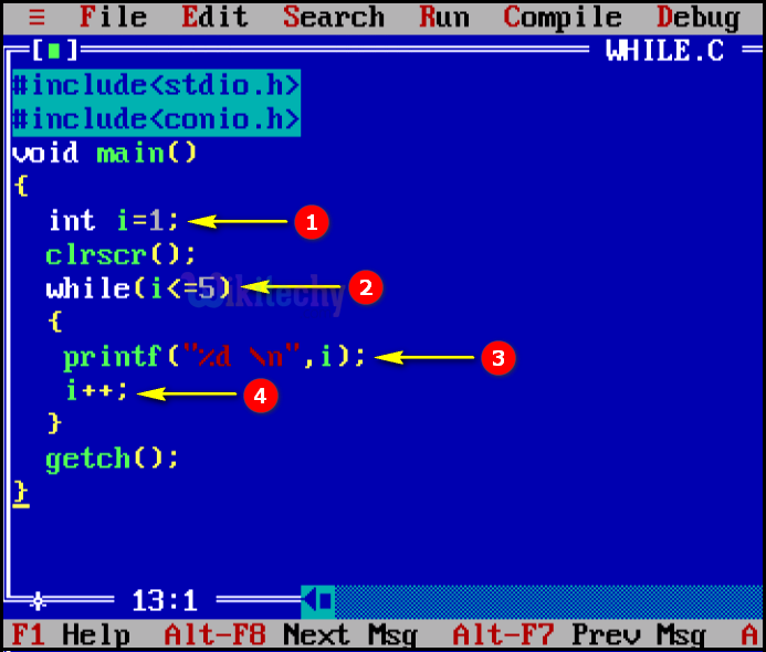 - Here in this statement we declare and initialize the value of “i=1”.